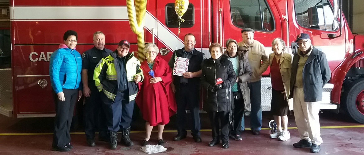 Featured in photo from left to right: Lindyann Vines, SummerWood employee; Lt. Keith Albert; C.B., Fire Dept. Driver; Mimi Rabinowitz, resident; Brian Merrin, Firefighter; Ida Levy, Arleen Bogen, Leo Novarr, Barbara Luchs and Herb Jones, residents.